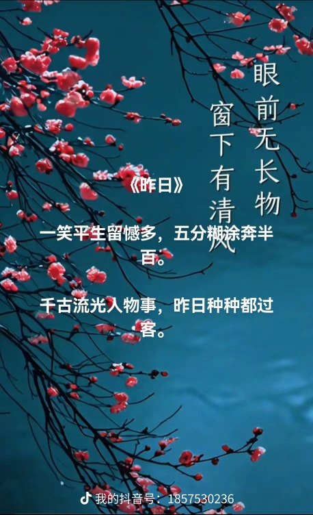 《昨日》 发布时间: 2025-05-14 13:25:25.0 近当代 作者: 子枫 收藏本文 显示注解 113 0 0 0 一笑平生留憾多,五分糊涂奔半百。千古流光人物事,昨日种种都过客。 上一篇: 下一篇:何处是天堂